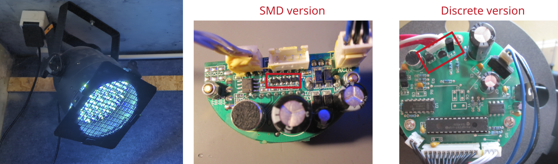 The much too high voltage across the transistor for the color blue is clearly visible. As this transistor is loaded more than the others due to the higher current consumption, it has broken down over time. It must be replaced. There are at least two versions of the assembly, an SMD version and a discrete version: