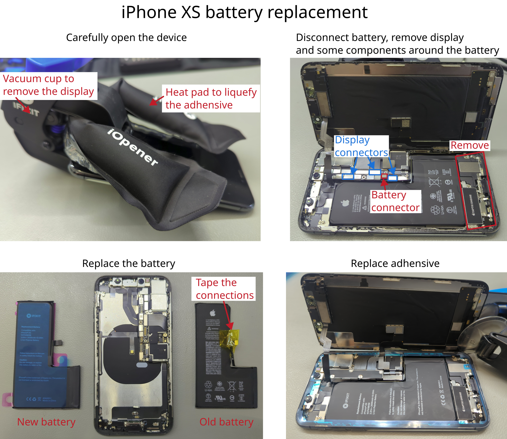 The battery replacement is based on the instructions from iFixit. The linked instructions are of high quality and contain many useful tips and tricks. Read them carefully before you start. Special tools are required, especially for the housing screws. The tools for opening are optional, but increase the success of the repair.