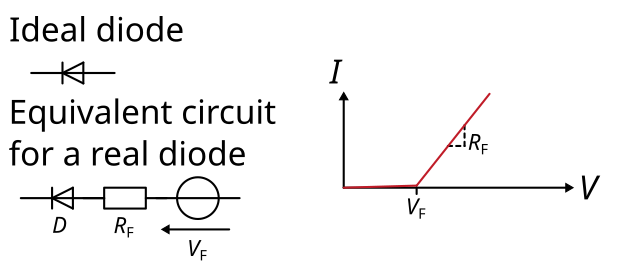 The equivalent circuit of a real diode contains a voltage source V_F which represents the forward voltage, a resistor R_F which represents the resistance of the diodes channel and an ideal diode D which represents the conducting behavior for current, which is only allowed in one direction. All together, with this equivalent circuit, the diodes forward characteristic can be modeled in the UI-diagram.