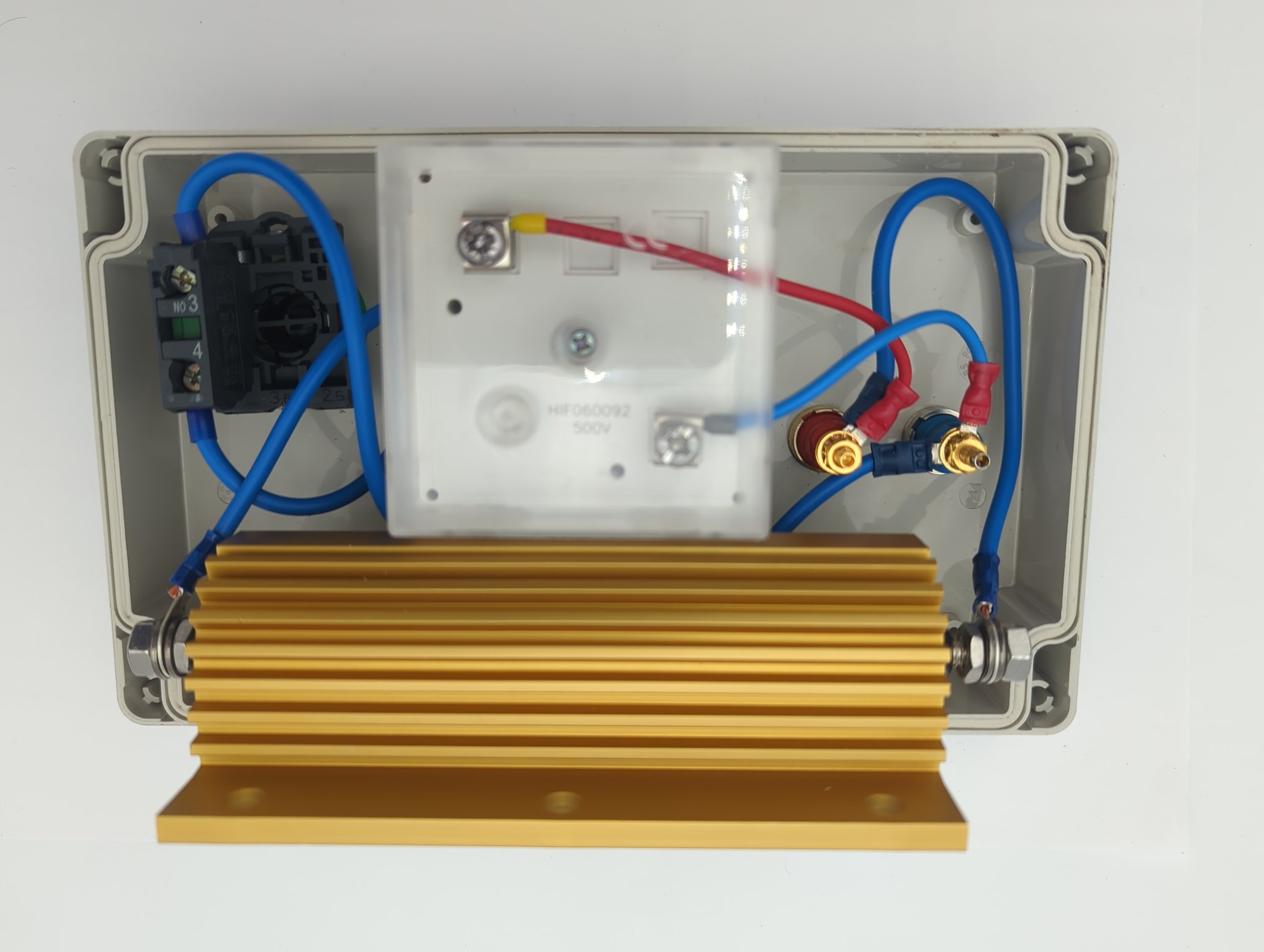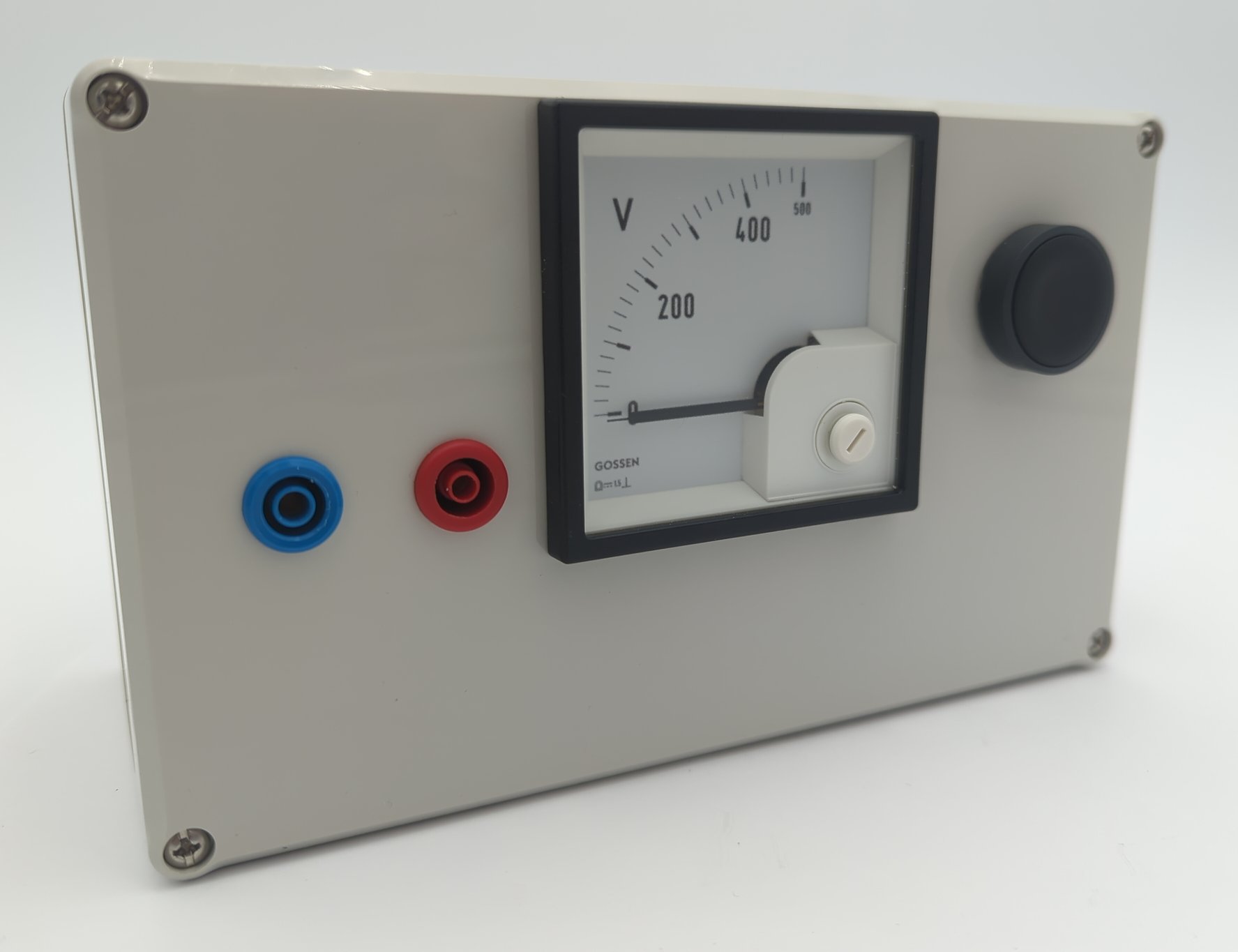 The discharge box has an internal resistor that can be connected in parallel to it via a button to discharge the DC link. The analog voltage display continuously measures the DC link voltage. Unlike many digital multimeters, it does not switch off after a certain period of time.