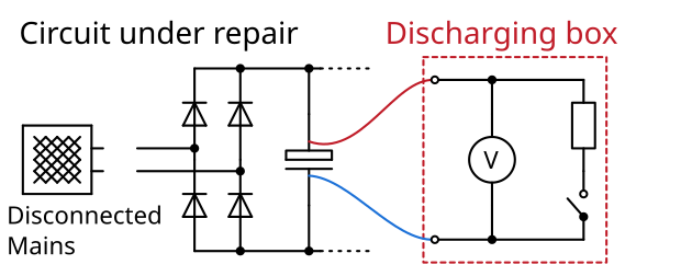 Single-phase switching power supplies usually have a DC link capacitor that is charged to 325 V (diode rectifier) or approx. 380 V (circuits with power factor correction), depending on the design. Before starting repairs, you must ensure that this capacitor is discharged. In most cases, the capacitor discharges after the power plug is pulled due to the energy requirements of the downstream electronics or due to a discharge resistor. In defective devices, however, the capacitor may not discharge when the power plug is pulled. This is why this discharge box is presented.